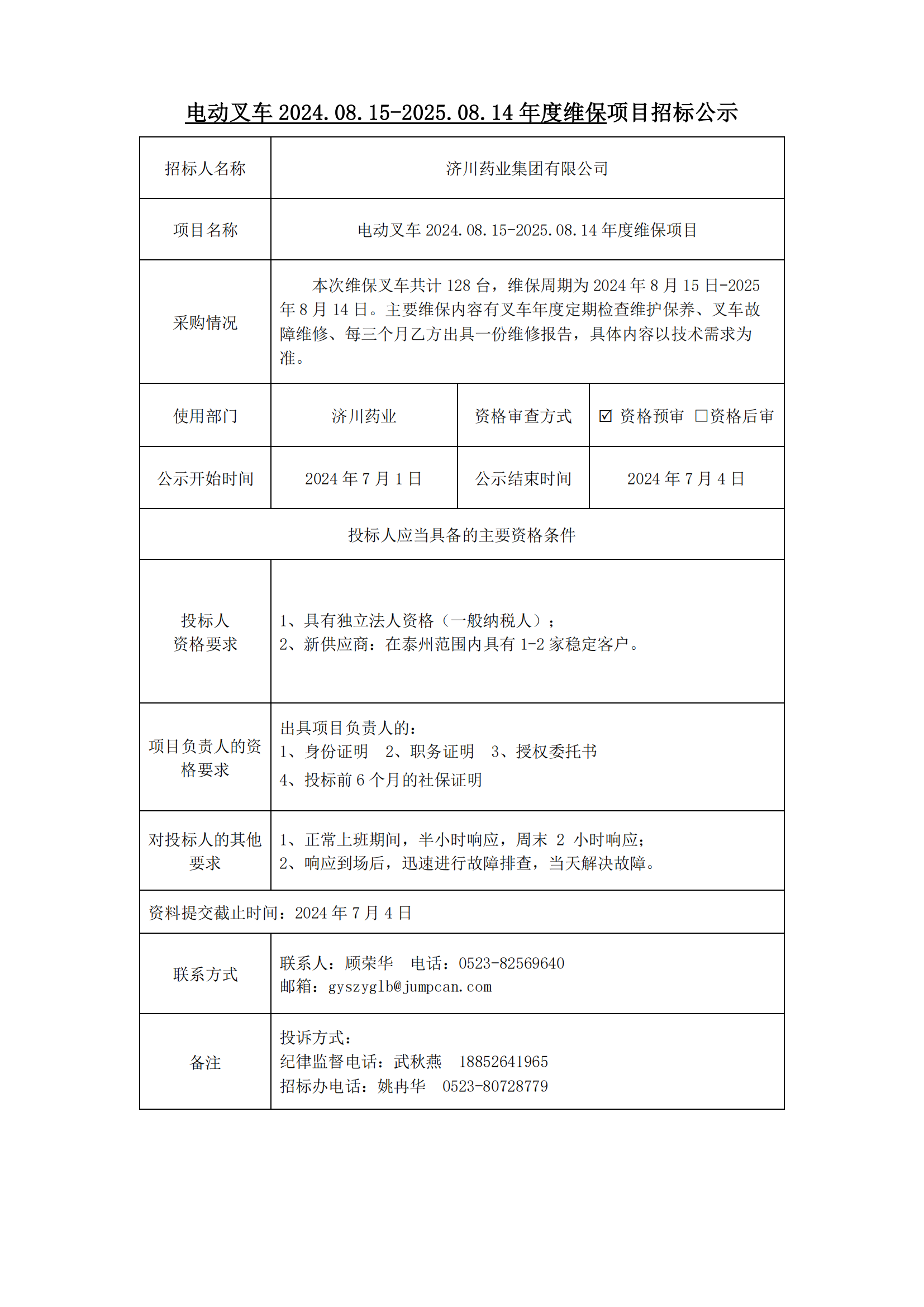 电动叉车2024.08.15-2025.08.14年度维保项目招标公示