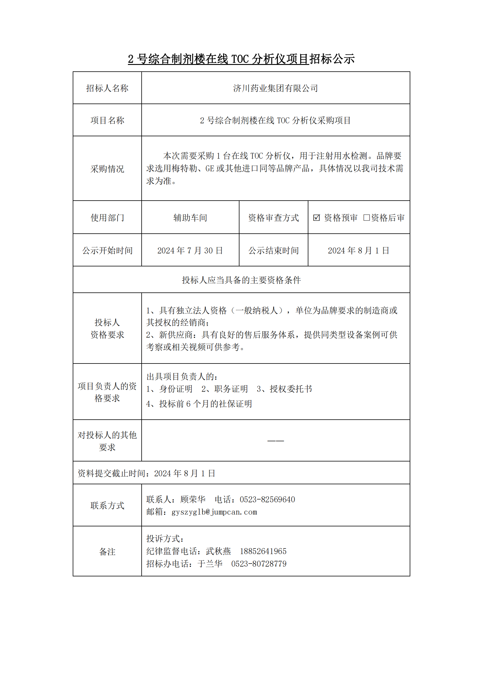 2号综合制剂楼在线TOC分析仪项目招标公示