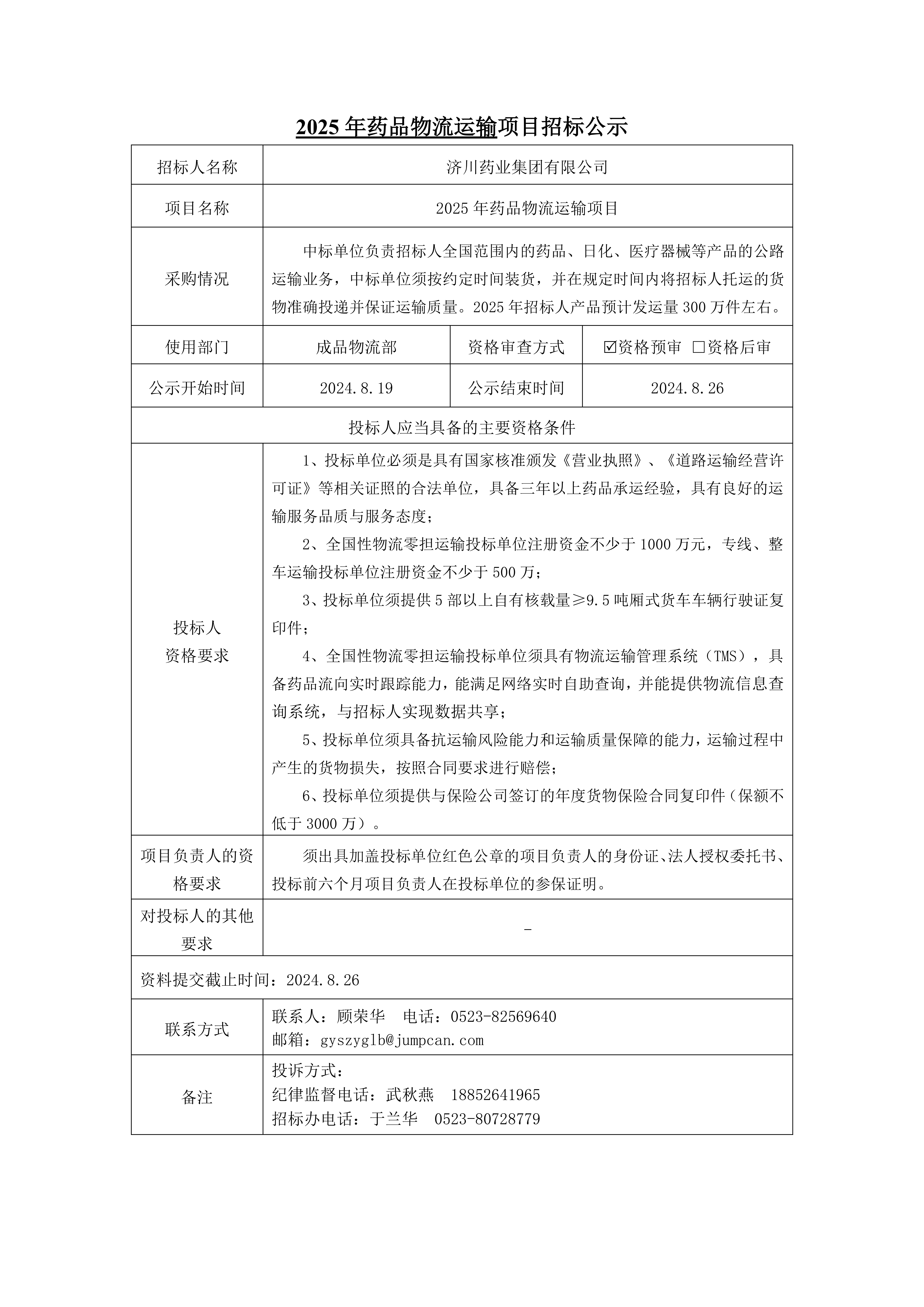 2025年药品物流运输项目招标公示