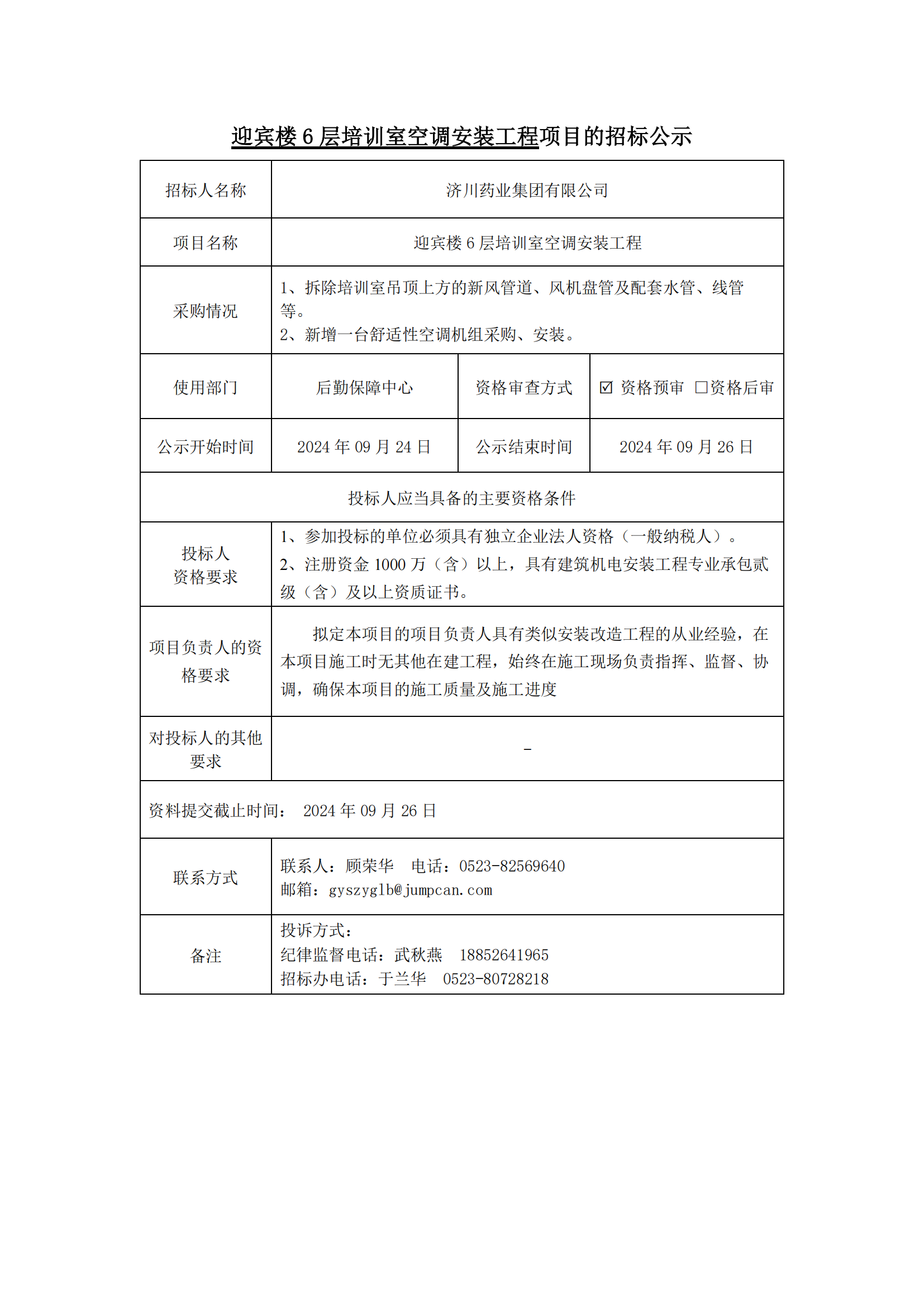 迎宾楼6层培训室空调安装工程-招标公示