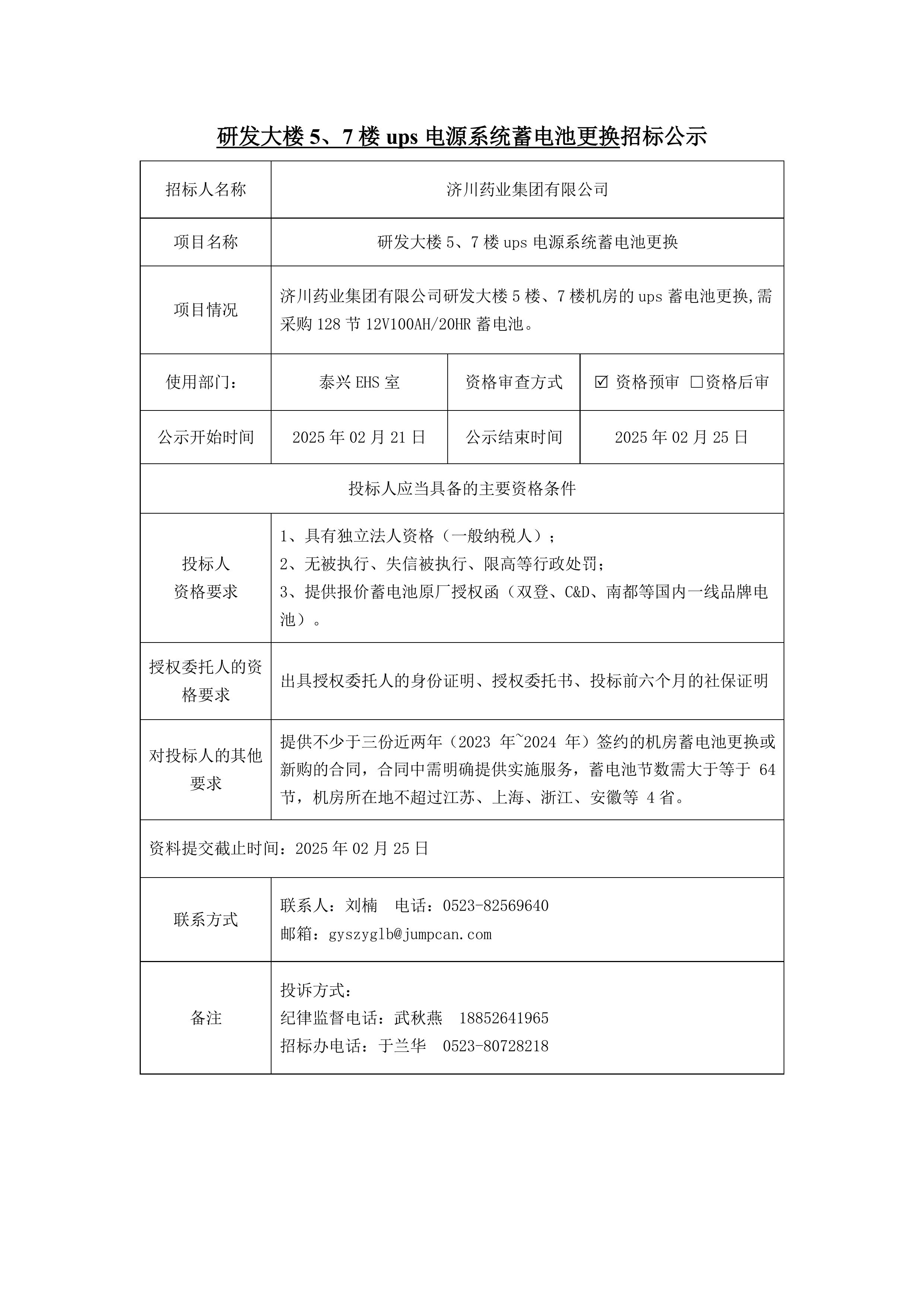 研发大楼5、7楼ups电源系统蓄电池更换招标公示