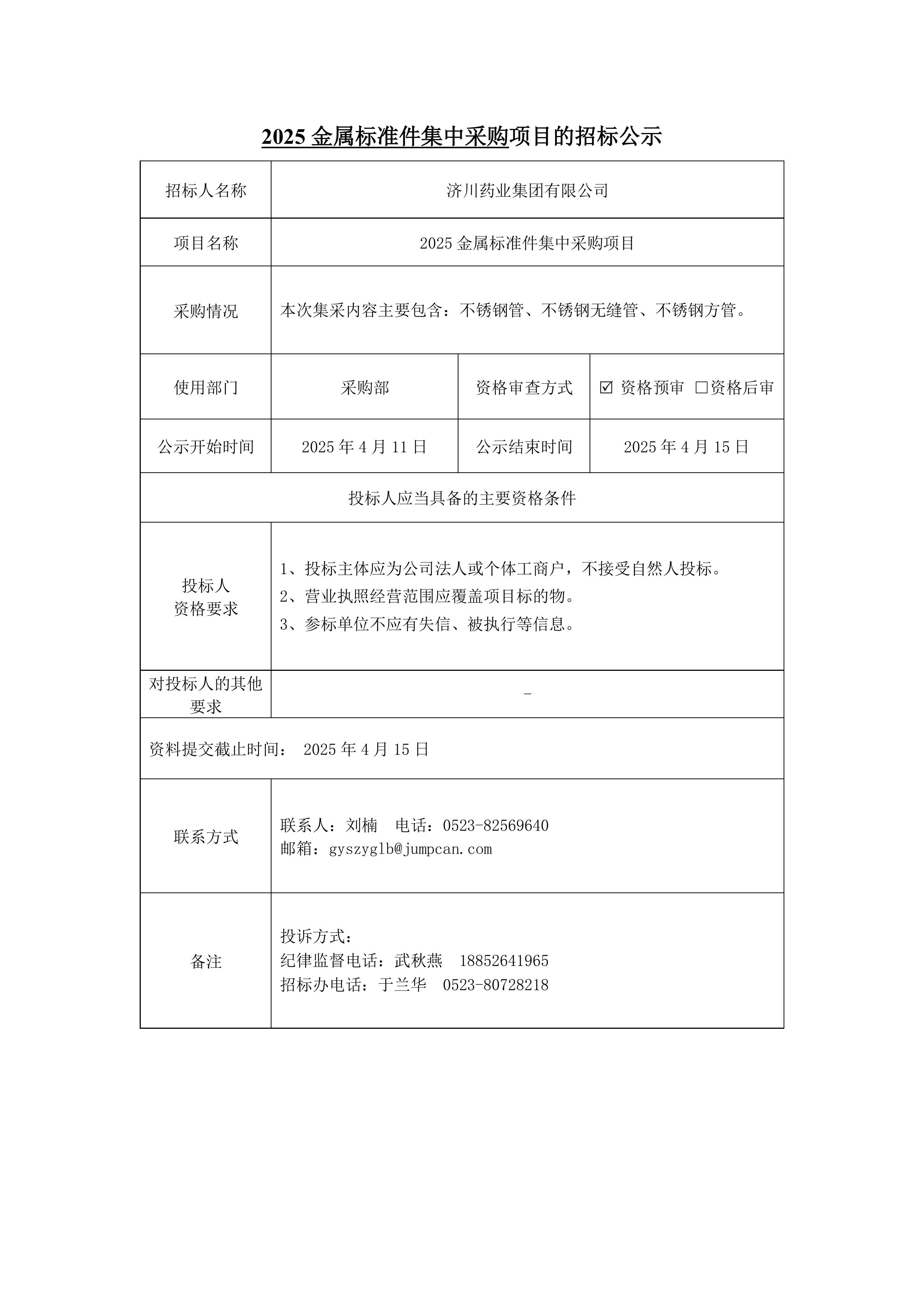 2025金属标准件集中采购项目的招标公示