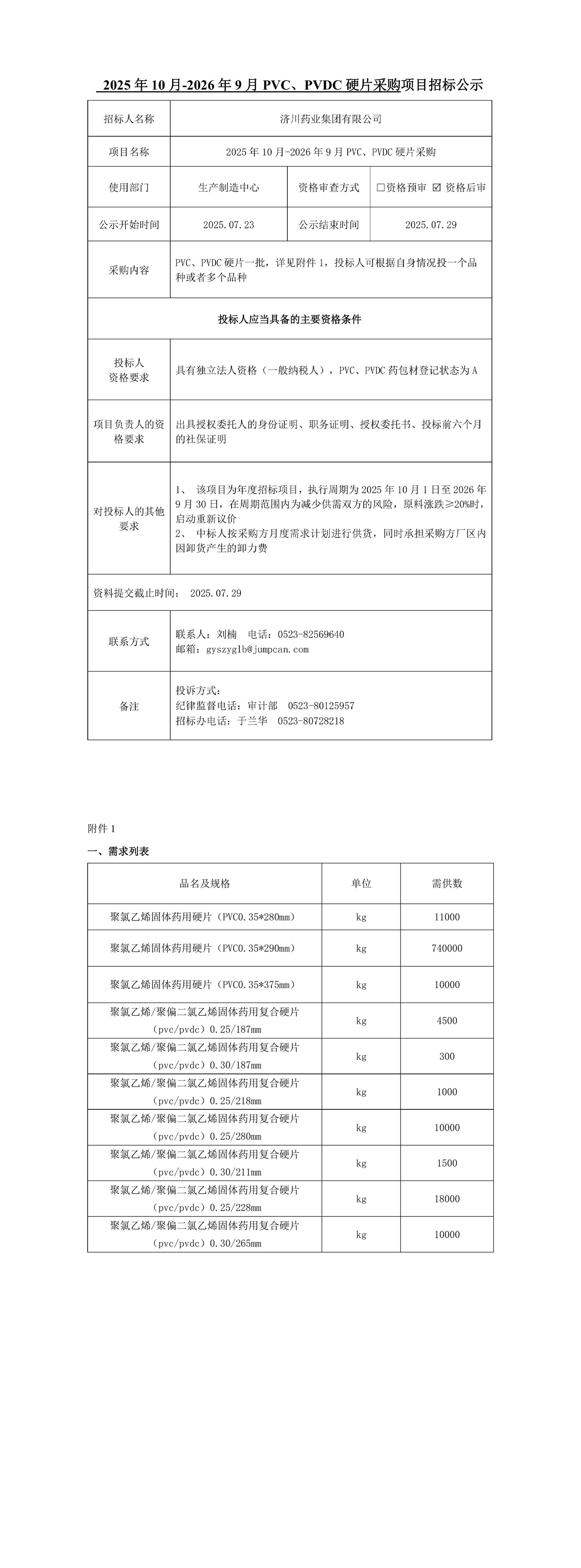 2025年10月-2026年9月PVC、PVDC硬片采购项目招标公示