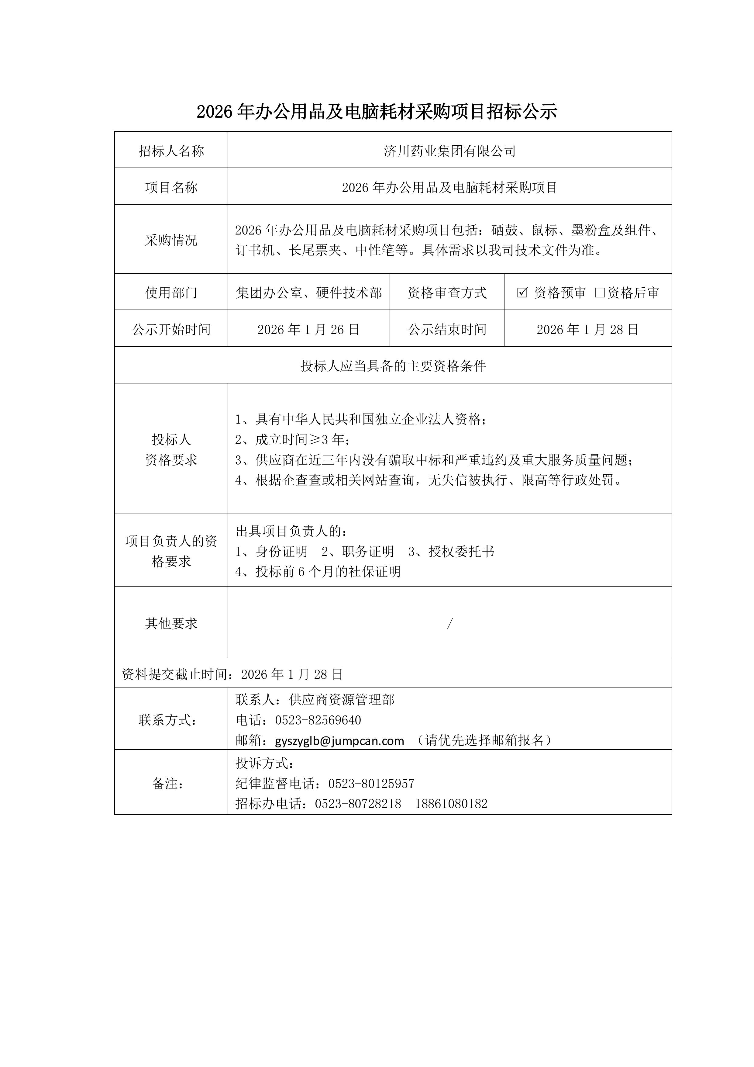 2026年办公用品及电脑耗材采购项目招标公示