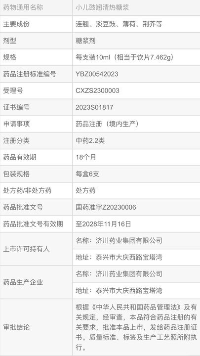 小儿豉翘清热糖浆属于中药2.2类新药,是济川药业针对儿科差异化用药需求,基于国家医保产品小儿豉翘清热颗粒的临床优势,在现有组方、给药途径和适应症的基础上,应用新工艺、新技术而开展的新剂型改进。