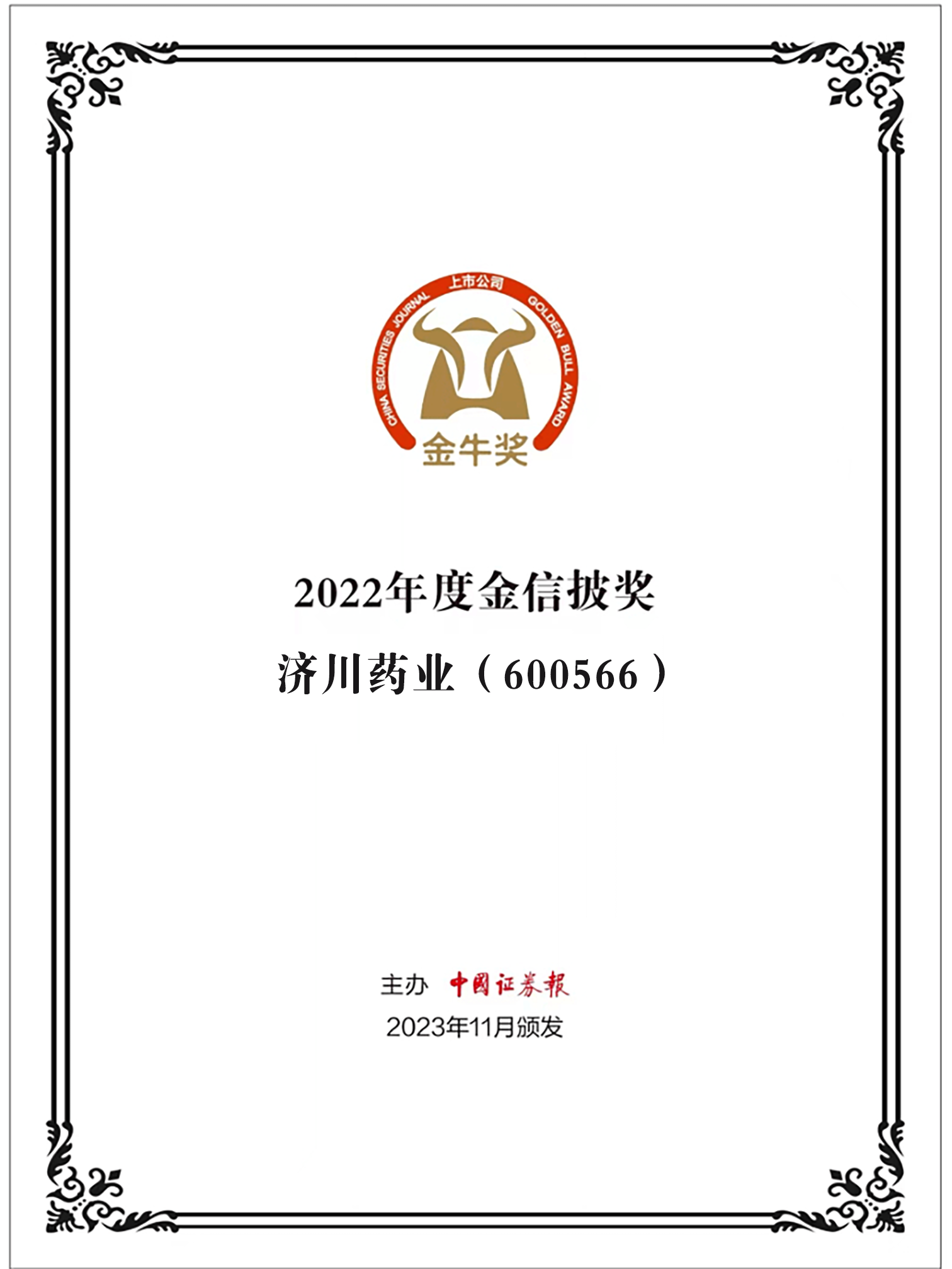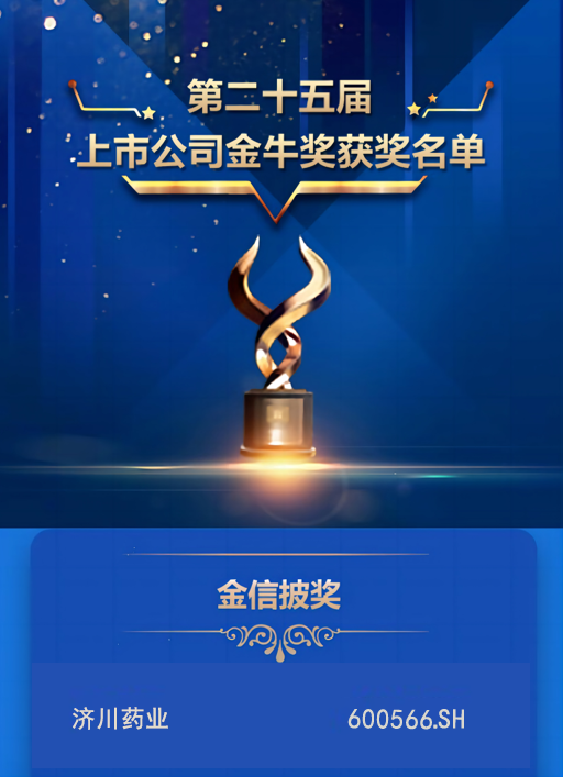 近日,2023上市公司高质量发展论坛暨第25届上市公司金牛奖颁奖典礼隆重举行,现场共揭晓“金信披奖”“港股金牛奖”等八大奖项,济川药业凭借在信息披露、投资者关系管理、发展规模、业务创新等方面的优异表现,荣获“2022年度金信披奖”。