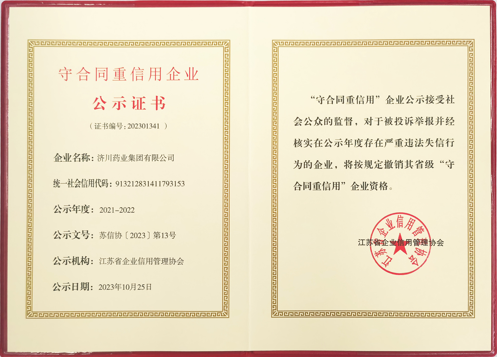 近日,为进一步营造诚实守信的市场营商环境,增强企业社会责任感,推进江苏省企业信用体系建设,江苏省企业信用管理协会开展“2021-2022年度江苏省守合同重信用企业”公示工作。济川药业集团有限公司顺利通过公示,获颁“守合同重信用企业”荣誉证书。